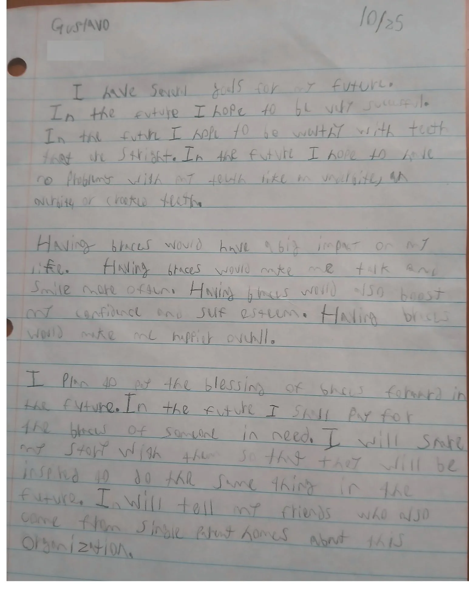 I plan to pay the blessing of braces forward in the future. In the future, I will pay for the braces of someone in need. I will share my story with them so that they will be inspired to do the same thing in the future. I will tell my friends who also come from single parent homes about this organization.