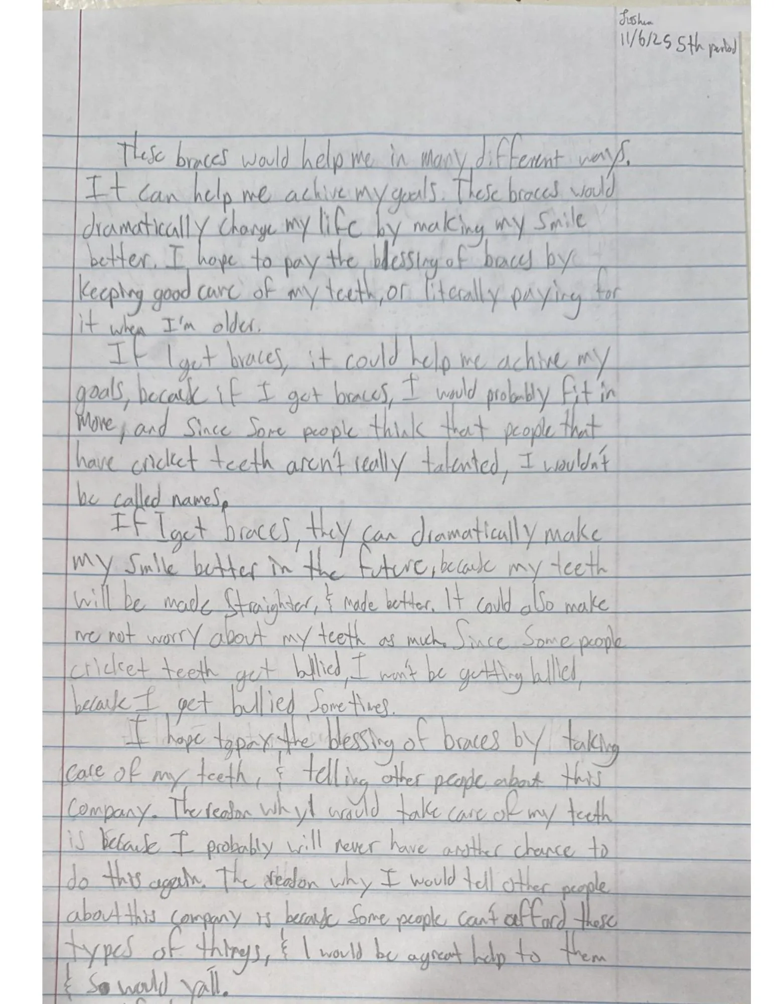 If I get braces, it could help me achieve my goals, because if I got braces, I would probably fit in more, and since some people think that people that have crooked teeth aren’t really talented, I wouldn’t be called names.