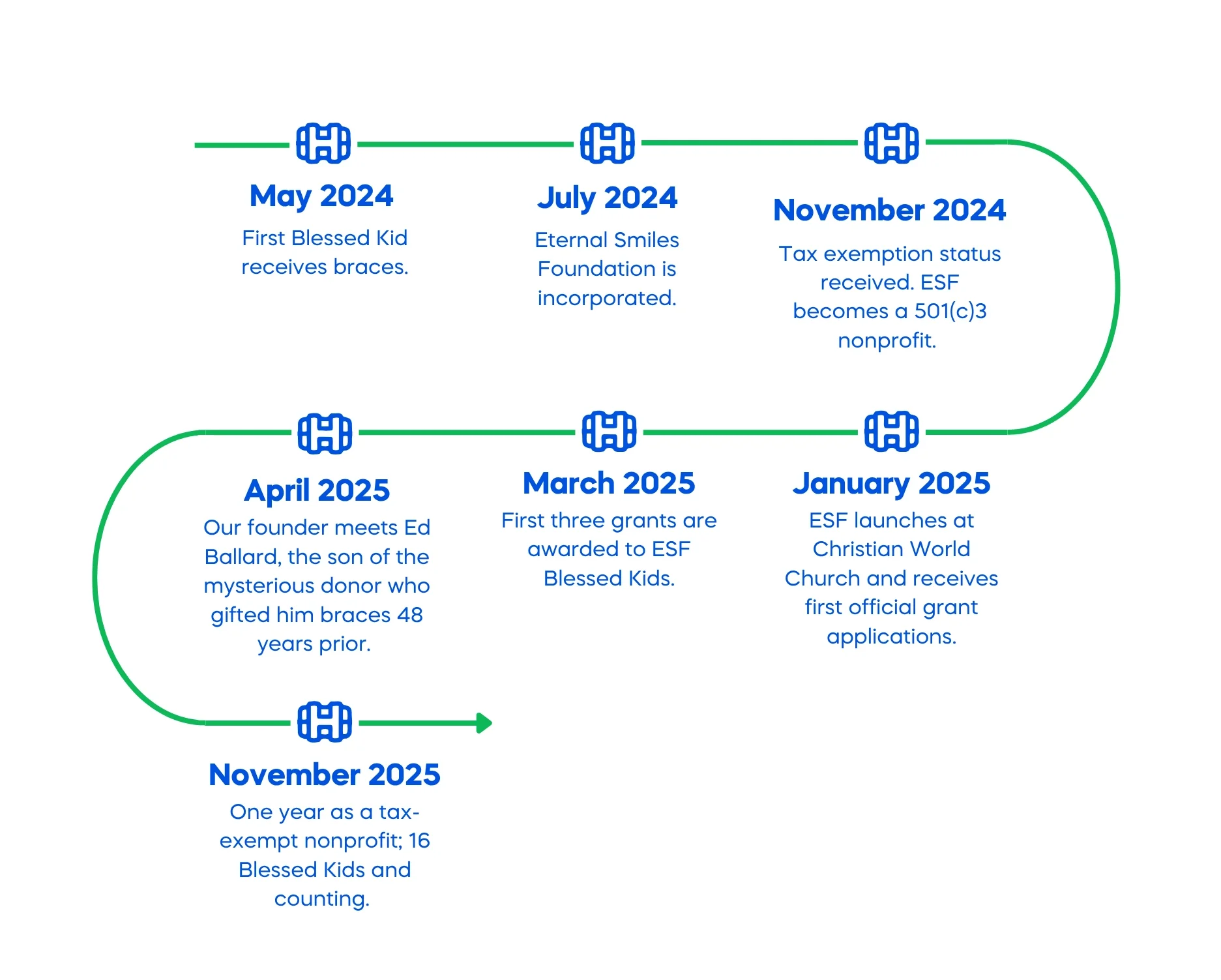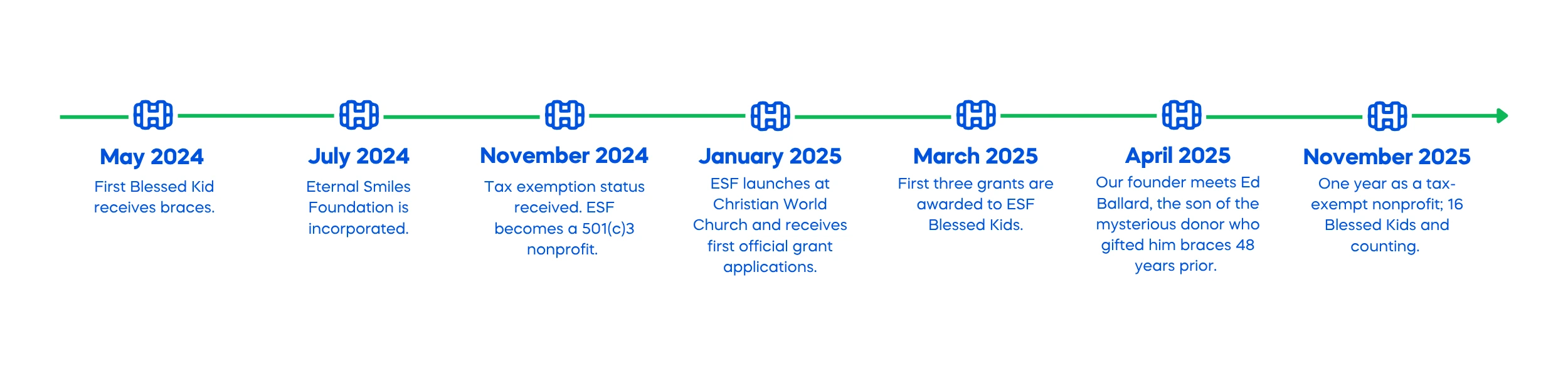 By the end of 2026, our goal is to have provided free braces to 70 total Blessed Kids. Learn about our progress and see how you can contribute to our mission below.